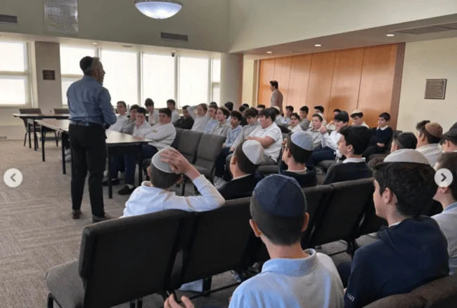 Founder and CEO Ike Dweck speaking to Magen David Elementary school boys about the risks and dangers of gambling. X