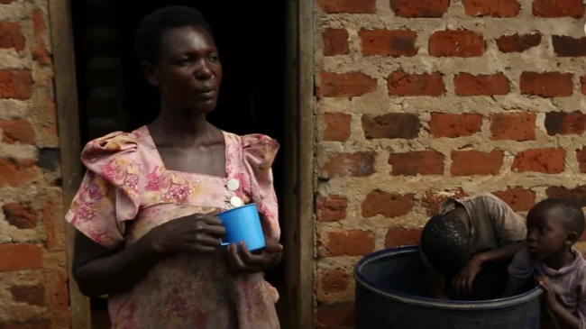 A woman named Mistress Kaliro stands outside her house, holding a blue cup, with two young children beside her.